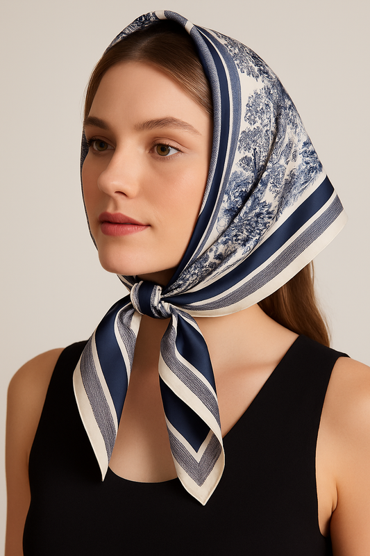 CD Silk Navy Toile Scarf Bandana β Square Headscarf for Women