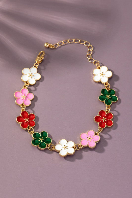 This vibrant enamel flower bracelet features a delightful mix of pink, red, green, and white blossoms, each accented with a gold-tone center and fine edging.