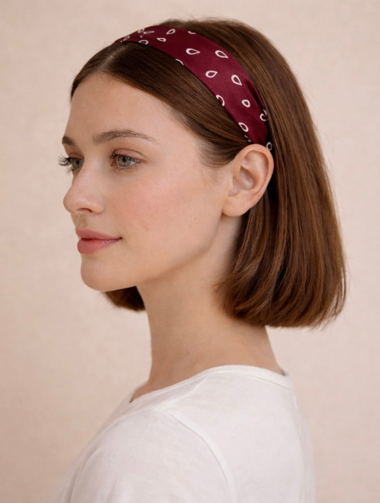 Its deep burgundy tone and delicate white droplet pattern make it perfect for styling around your neck, hair, handbag, or wrist. Versatile, chic, and effortless—this scarf is your new must-have for everyday elegance.