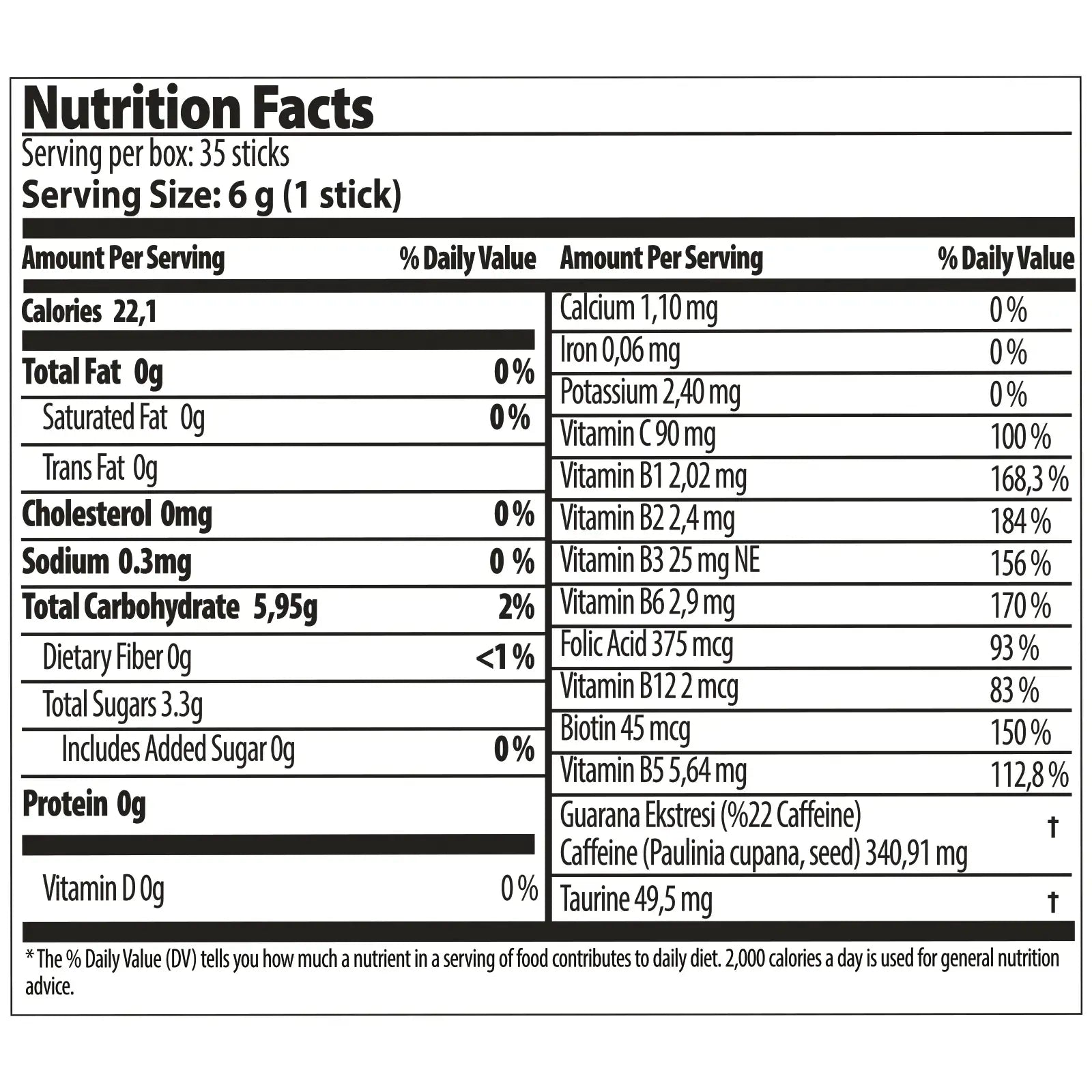 Thanks to its blend of Guarana, Taurine, and vitamins, it boosts your daily performance 35 individual sachets, easy to carry and use anywhere Gluten-free, no sweeteners or artificial colors, no preservatives, and lactose-free