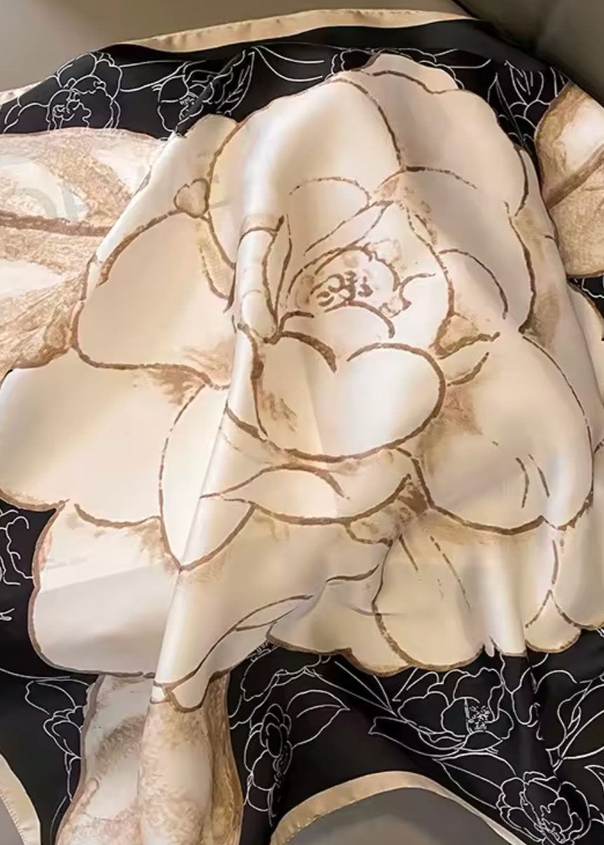Make a bold yet timeless statement with our Silk Black & White Floral Scarf Bandana, a luxurious accessory that blends sophistication with versatility. Featuring an oversized floral motif in soft ivory tones framed by a deep black background, this scarf creates a striking contrast that elevates any outfit.
