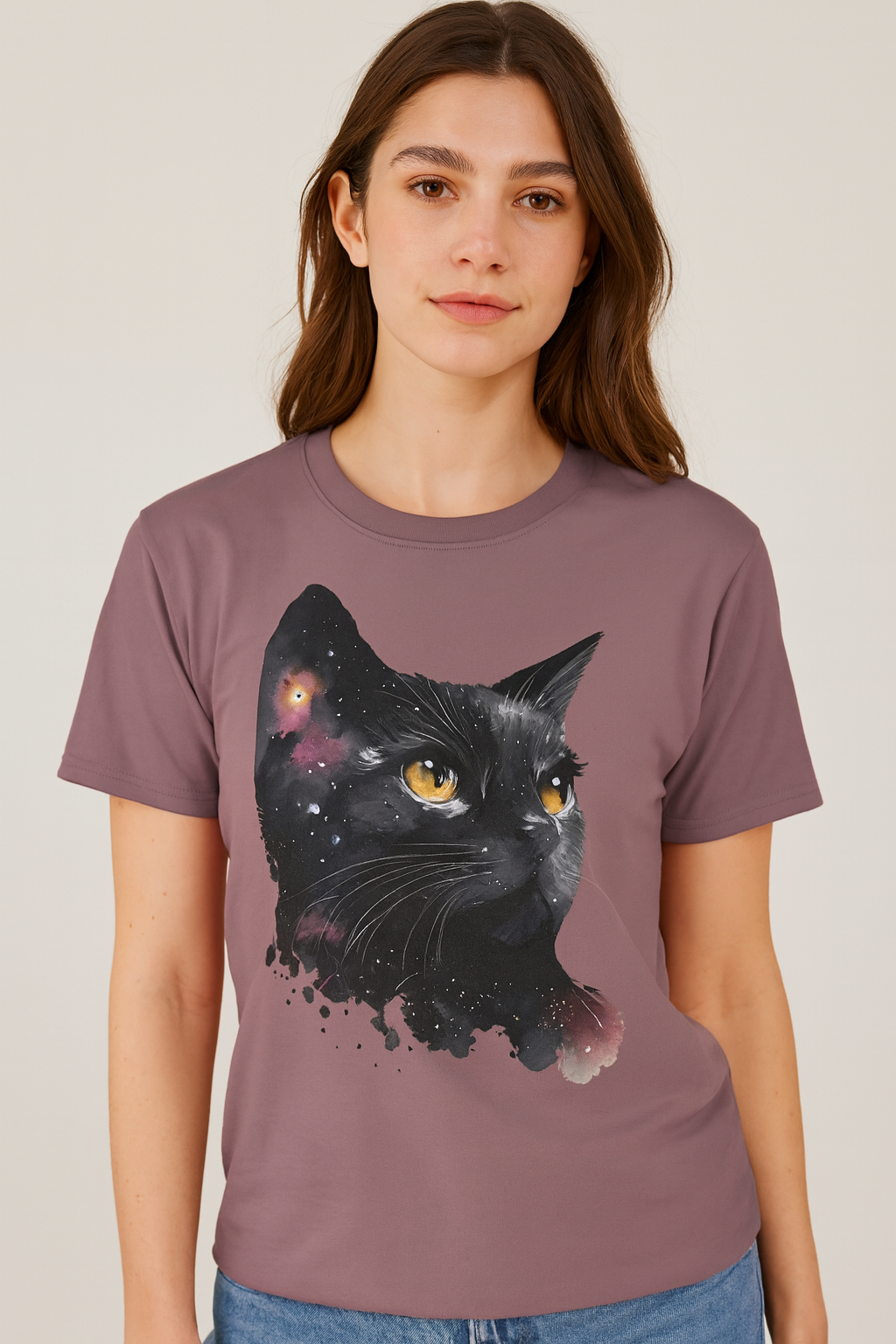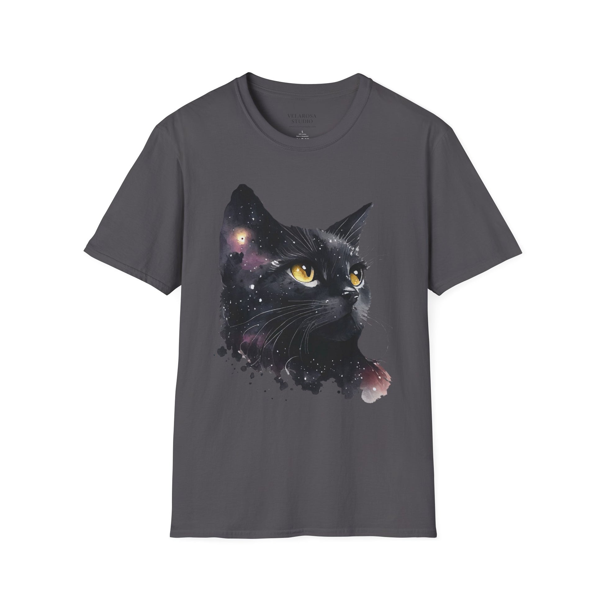 Add a touch of cosmic charm to your wardrobe with our Galaxy Black Cat Unisex T-Shirt. Featuring a stunning watercolor-style illustration of a black cat with piercing golden eyes, surrounded by a dreamy galaxy of stars, this shirt is perfect for cat lovers and space enthusiasts alike.