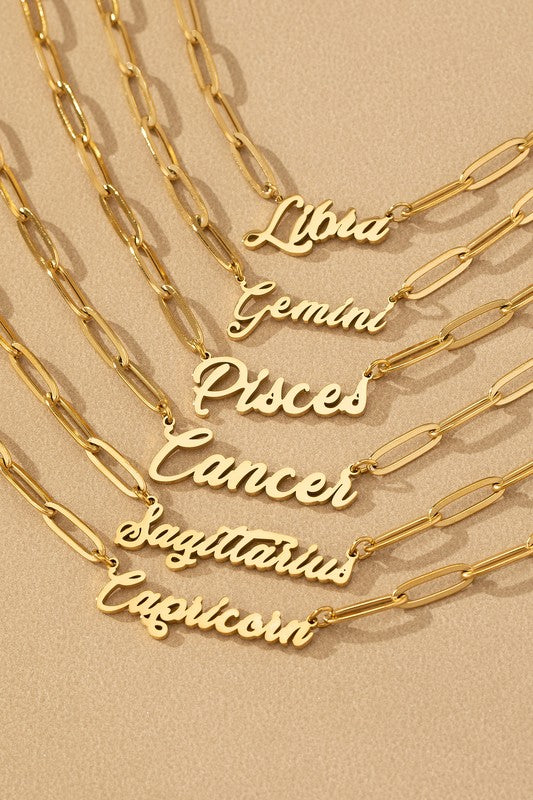 Water proof stainless zodiac sign pendant necklace with delicate paper clip chain